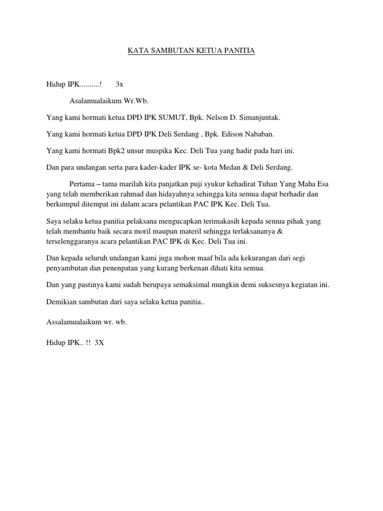 Salam sejahtera untuk kita semua,. Laporan ketua panitia pelaksana rapat koordinasi dan workshop refocusing kegiatan dan anggaran dak bidang pertanian tahun 2015 dan 2016 bandung . Pidato ketua panitia dan ketua organisasi, sambutan dan laporan ketua . Contoh kata sambutan pembukaan acara contoh soal dan contoh pidato. Panitia seminar nasional kelompok, contoh teks pidato sambutan ketua panitia.